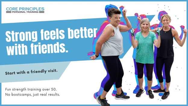 It’s not a bootcamp and it isn’t chaos. It’s small groups so you can hear your name, laugh with people your age, and get perfectly scaled exercises that work around knees, backs, or shoulders that have history. It’s a coach adjusting your stance so your body says “ahh, that’s better,” and a friend cracking a joke between sets. And it’s you walking out energized, not wiped. That’s the experience we build every day inside Core Principles Personal Training—a studio designed for adults 50+.